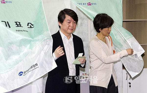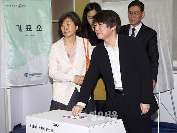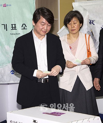 [일요서울 | 정대웅 기자]  제19대 총선일인 11일 서울 용산 한강초등학교에 마련된 한강로 제4투표소를 찾은 안철수 원장과 부인 김미경씨가 투표를 하고 있다.