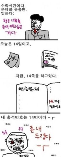 특히 만화 속 주인공은 선생님이 오늘 날짜 14일을 확인하고 14번에게 문제 풀이를 시킬 것 이라고 예상하곤 “왜 하필 나의 번호는 14번”이라고 말해 네티즌들의 공감을 자아냈다.