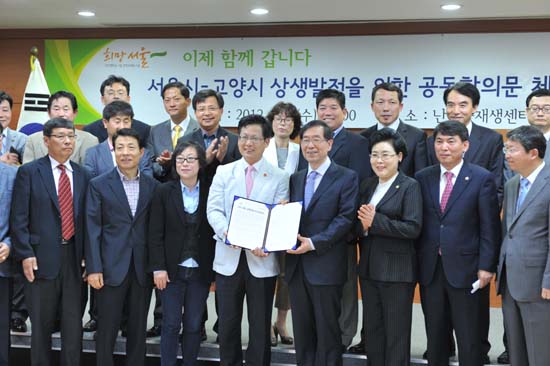 박원순 서울시장과 최성 고양시장은 2월 오전 11시 고양시 현전동 난지물재생센터에서 공동 기자회견을 갖고 ‘서울시-고양시 상생발전을 위한 공동합의문’을 체결했다.