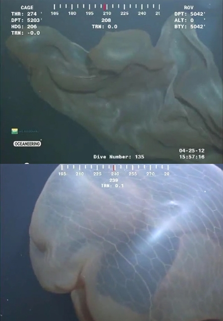 충격적 심해 괴생물의 정체애 대해 고래의 태반 혹은 데프스타리아 에니그마티카로 불리는 희귀 심해 해파리의 일종이라는 주장도 나오고 있지만 확인된 바는 없다.