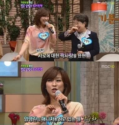 강수화씨는 모녀지간에 서로 창피했던 점을 꼽는 부분에서 “어머니가 여배우고 아름답게 보여야하는데 KTX나 비행기를 타면 꼭 뭘 드셔야 한다. 드시다가 조용해서 보면 ‘크르렁’하면서 크게 코를 곤다”고 밝혀 웃음을 자아냈다.
