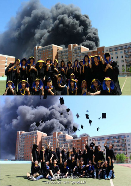 지난 26일 중국판 트위터 웨이보에서는 화재 다렌이공대학의 학사 졸업 사진이 게재됐다.