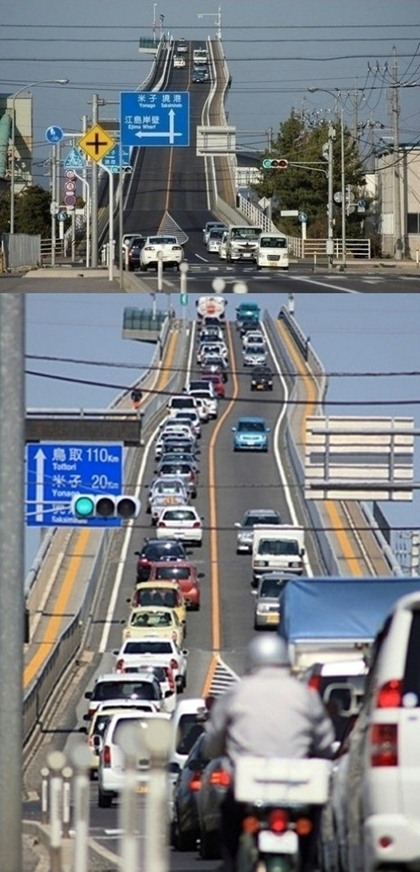 공개된 사진은 일본 돗토리현 사카이마나토시에 위치한 에지마대교의 모습을 촬영한 것으로 경사의 아찔한 각도로 인해 보는 이들을 어지럽게 만들었다.