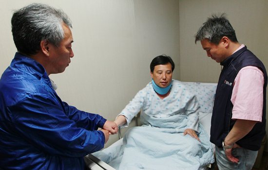 ▲ 지난달 14일 오후 민주노총 김영훈 위원장(오른쪽)과 금속노조 박상철 위원장이 통합진보당 중앙위원회회의 당시 일부 당원들에 의해 부상을 입은 조준호 전 공동대표를 찾아 위로를 하고 있다. <사진자료=뉴시스>