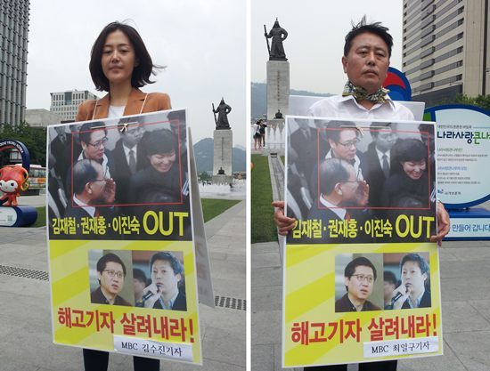 ▲ MBC 기자회가 지난 4일부터 서울 광화문 광장에서 해고기자 복직을 요구하는 릴레이 1인시위에 돌입한 가운데, 첫 시위자로 김수진, 최일구 앵커가 나서 피켓시위를 하고 있다. <사진자료=MBC기자회/뉴시스>