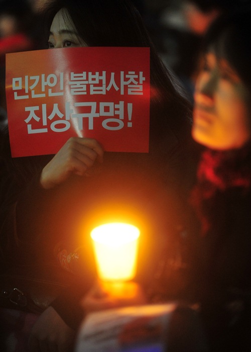 ▲ 민간인 불법사찰 비상행동 회원들이 지난 4월 4일 오후 서울 중구 대한문 앞에서 '민간인 불법사찰 및 은폐 규탄 국민 촛불집회'를 갖고 있다.<서울=뉴시스>
