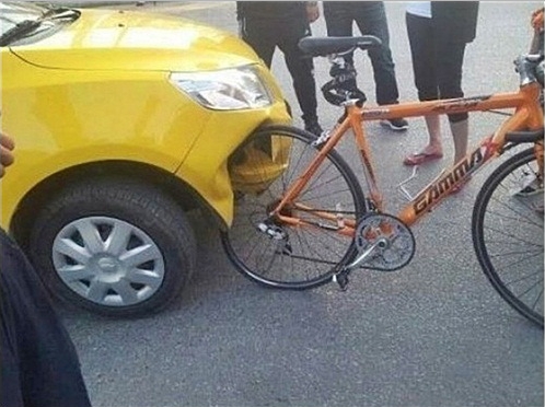 공개된 ‘자전거 만렙’ 사진 속에는 노란색 자동차와 부딪힌 자전거의 뒷바퀴 모습이 담겨있다.