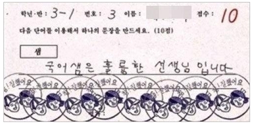 ‘사회성 뛰어난 아이’ 게시물에는 한 초등학교 3학년의 답안지 사진이 담겨있다. ‘샘’이라는 단어를 이용해서 하나의 문장을 만들라는 문제를 본 한 아이는 ‘국어샘은 훌륭한 선생님입니다’라는 답을 내놨다.