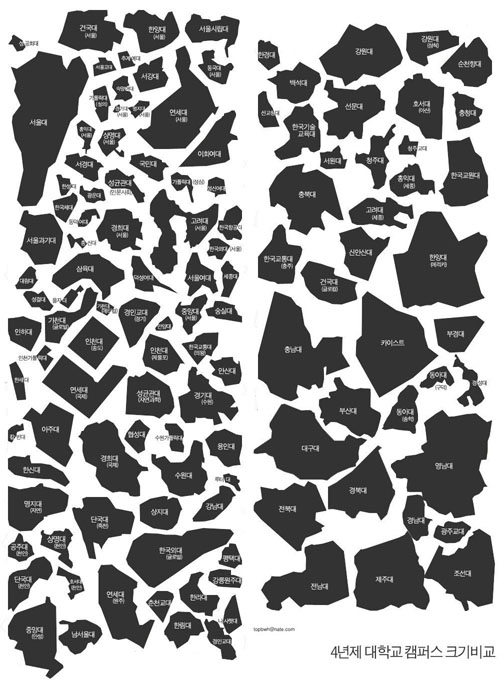 공개된 ‘캠퍼스 크기 비교’ 사진 속에는 전국에 있는 4년제 대학 캠퍼스들이 크기대로 옹기종기 모여 있다.