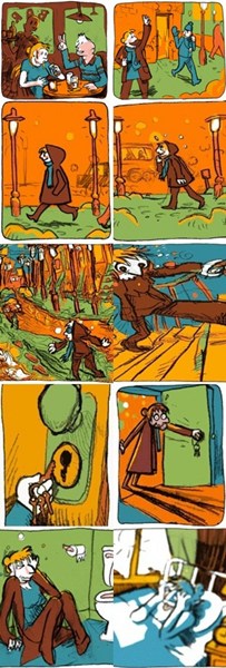 특히 술이 잔뜩 취한 뒤 집에 와서도 열쇠조차 제대로 끼우지 못하며 집에 들어서자마자 구토가 몰려와 화장실로 달려간다. 결국 다음날 일어난 주인공은 두통에 시달린다.