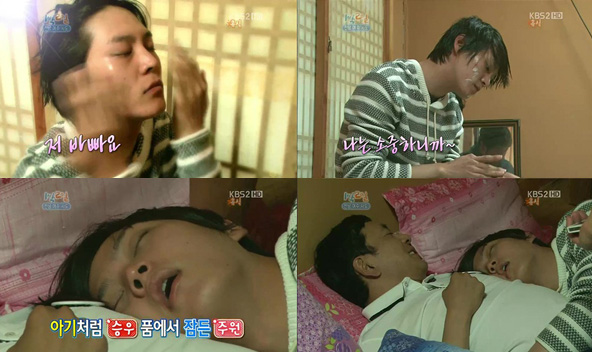 이후 맏형 김승우의 품에 안겨 입이 벌린 채 숙면을 취하는 주원의 모습은 안타까움과 동시에 웃음을 자아냈다. 최근 빡빡한 드라마 스케줄로 인해 바닥에 눕자마자 정신없이 잠에 빠진 것이다. 주원은 KBS 수목드라마 각시탈의 카리스마 주인공 이강토역을 맡고 있다