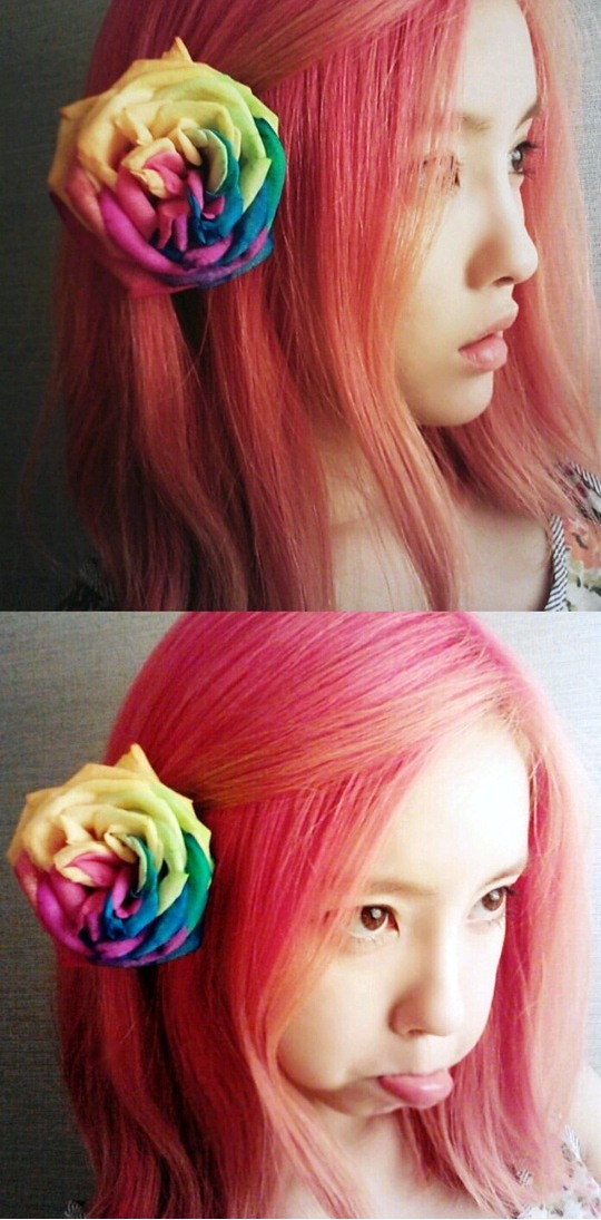 공개된 사진 속 효민은 핑크빛 머리에 꽃모양 머리핀을 얹어 인형미모를 과시하고 있다.