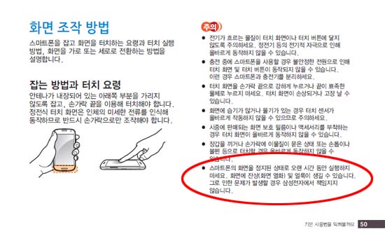 갤럭시S3 제품 설명서에는 “스마트폰의 화면을 정지된 상태로 오랜 시간 실행하지 마세요. 화면에 잔상(화면 열화) 및 얼룩이 생길 수 있다. 그로 인한 문제가 발생할 경우 삼성전자에서 책임지지 않는다”라는 문구가 들어있다.