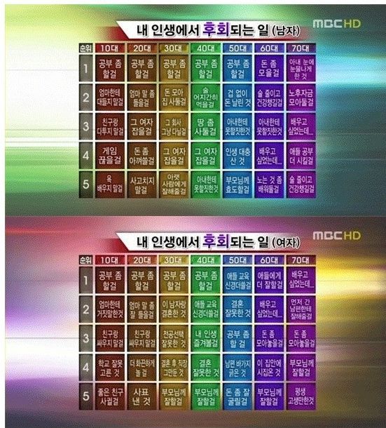 공개된 ‘가장 많이 하는 후회’ 게시물에서 남자와 여자는 모두 10대부터 40대까지 ‘공부 좀 할걸’이란 후회를 1위로 꼽았다.
