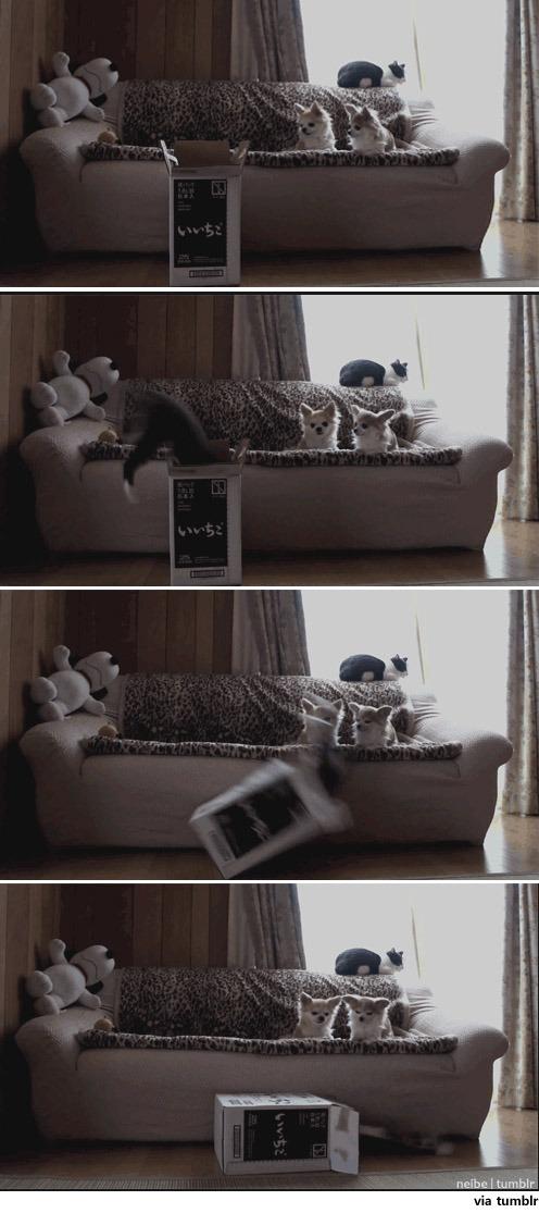 공개된 ‘허세 고양이’ 영상 속에는 강아지 두 마리가 소파에 앉아 있다. 그러다 갑자기 고양이 한 마리가 박스 속으로 몸을 날리지만, 박스가 엎어져 민망한 상황이 연출된다.
