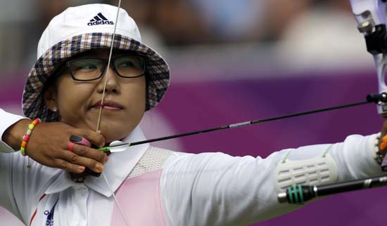 ▲ 2일(현지시간) 영국 런던 로즈 크리켓 그라운드에서 열린 2012 런던 올림픽 여자 양궁 개인전 16강전에서 한국 이성진이 활을 쏘고 있다. <뉴시스/AP>