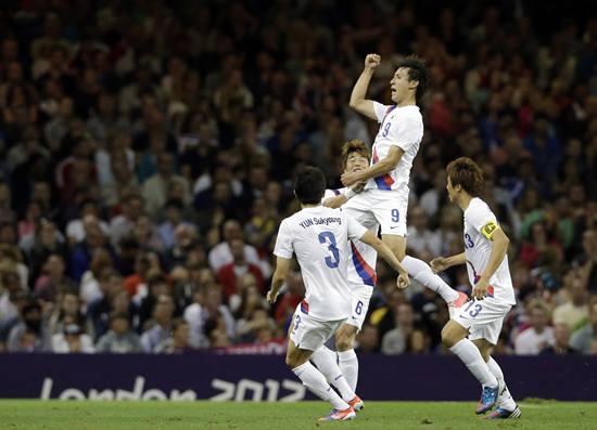 ▲ 한국 올림픽 축구대표팀 지동원이 지난 5일 새벽(한국시간) 런던올림픽 남자 축구 8강전에서 영국을 상대로 득점을 한 뒤 윤석영, 구자철, 기성용과 함께 기쁨을 나누고 있다. <사진자료=AP|뉴시스>