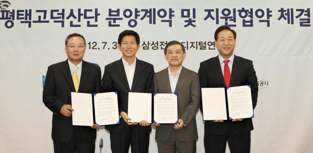 김문수 경기도지사와 권오현 삼성전자 대표이사 부회장, 김선기 평택시장, 이재영 경기도시공사 사장은 이날 삼성전자 본사에서 고덕산업단지에 대한 분양계약을 체결했다. 이날 계약으로 삼성전자의 고덕산업단지 입주가 최종 확정된 셈이다. 김 지사는 “글로벌 경제위기로 모든 계획이 무산될 뻔한 어려움이 있었지만 삼성전자의 경영 능력이 이를 극복했다”면서 “단일 프로젝트로는 대한민국 건국 이래 최대 규모의 투자를 이끌어 냈다”고 말했다. 이어 “삼성 등 우리나라 대표선수의 기를 더 살려야 젊은이들이 일자리를 하나라도 더 얻는다”고 했다.