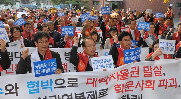 [일요서울|고동석 기자] 최근 전국 국립대 교수들이 교육과학기술부의 총장직선제 폐지와 관련해 정부의 위헌위법적인 총장직선제 폐지 강박과 그에 굴복해 총장직선제 폐지에 앞장서고 있는 국립대 총장들의 반민주적인 작태를 규탄한다며 거세게 반발하고 있다.
