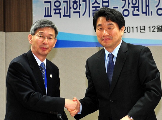 ▲ 교과부-강원대,강릉원주대 구조개혁방안 추진을 위한 MOU체결식이 열린 가운데 이주호 교과부 장관(오른쪽)과 강릉원주대 윤경호 총장직무대행의 체결식(2011.12.9)<뉴시스>