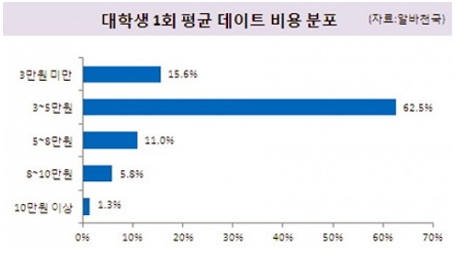 [일요서울|고은별 기자] 대학생 10명 중 6명은 평균 데이트 비용을 1회 3만 원에서 5만 원 정도 쓰는 것으로 조사됐다.