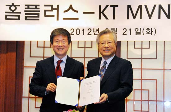 홈플러스와 KT는 21일 서울 삼성동 그랜드인터콘티넨탈 호텔에서 대형 유통업체 최초로 알뜰폰(MVNO) 사업에 관한 전략적 파트너 협정을 체결하고 알뜰폰 활성화 및 유통‧통신 결합 서비스에 대한 양사간 협력관계를 구축했다고 밝혔다.