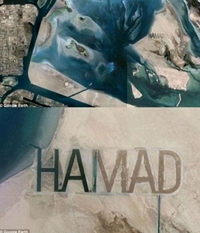 공개된 ‘우주급 허세’ 사진은 중동지역의 위성사진으로, 사진 속 모래섬에는 ‘HAMAD’라는 영어 이름이 새겨져 있다.