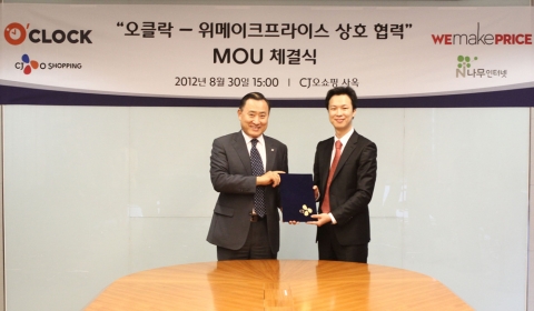 [일요서울|강길홍 기자] CJ오쇼핑(대표 이해선)의 소셜커머스 오클락(oclock.co.kr)과 위메이크프라이스(대표 박은상·허민)는 30일 CJ오쇼핑 본사에서 업무 제휴를 위한 양해각서(MOU)를 체결했다. 양사의 주력 상품군을 제휴해 상품 풀 확대를 위한 것으로, 협약식에는 이해선 CJ오쇼핑 대표와 박은상 위메프 대표가 참석했다.