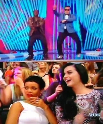 특히 무대를 지켜보던 팝스타 케이티 페리와 리한나는 깜짝 놀라며 즐거워하는 모습이 TV에 포착된 것. 케이티 페리는 말춤을 따라하는 듯 팔로 여러 가지 동작을 선보여 눈길을 끌었다.
