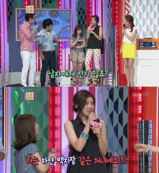 이에 장도연은 “난 모태솔로”라면서 “ 하얀 백지장과도 같은 처녀”라고 속내를 밝혀 시청자들을 폭소케 했다.