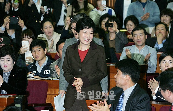 새누리당 박근혜 대선 후보가 30일 국회 헌정기념관에서 열린 '체육인복지법 제정을 위한 토론회'에 참석하며 체육인들의 환영을 받고 있다.