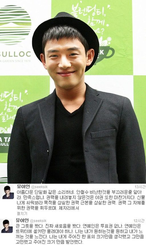 앞서 유아인은 지난 23일 오후 자신의 트위터를 통해 “아름다운 단일화 같은 소리하네”라는 글을 올려 눈길을 끌었다.