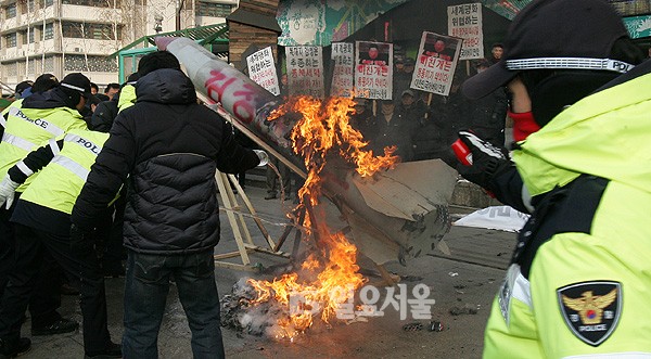 13일 오후 서울 광화문 KT사옥 앞에서 어버이 연합, 납북자 가족모임, 탈북난민인권연합 등 보수단체 회원들이 북한의 장거리 로켓 발사를 규탄하며 미사일 모형을 불태우자 경찰들이 불을 끄고 있다.