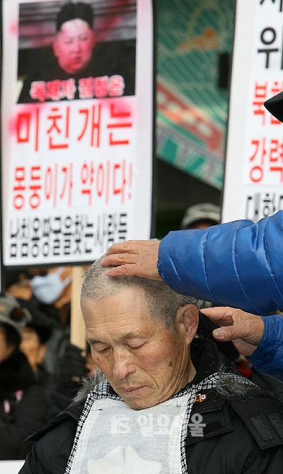 13일 오후 서울 광화문 KT사옥 앞에서 어버이 연합, 납북자 가족모임, 탈북난민인권연합 등 보수단체 회원들이 북한의 장거리 로켓 발사를 규탄하며 삭발식을 하고 있다.