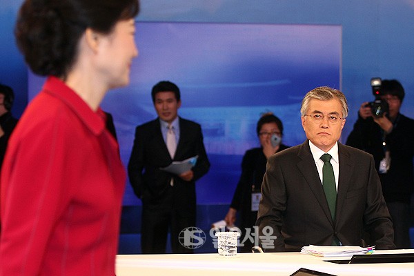 16일 저녁 여의도 KBS에서 열린 사회·교육·과학·문화·여성 분야 후보자 초청 3차 토론회에 새누리당 박근혜 대선후보 보다 앞서 도착한 민주통합당 문재인 대선후보가 박 후보를 바라보고 있다.