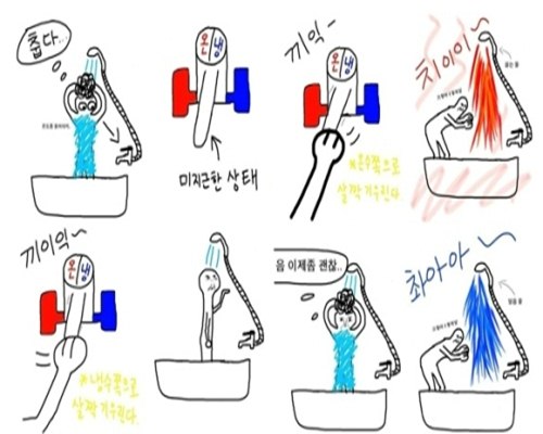 뜨거운 물로 샤워하고 싶어 왼쪽으로 돌리면 너무 뜨겁고 다시 중간을 맞추기 위해 오른쪽으로 샤워기 레버의 방향을 전환하면 물이 너무 차가워 지는 것.