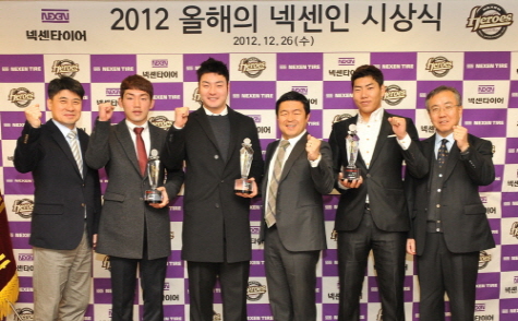 [일요서울|강길홍 기자] 넥센타이어(사장 강호찬)는 지난 26일 서울 방배동 넥센빌딩에서 ‘올해의 넥센인’을 시상하는 자리를 열었다. 이 자리에서 넥센히어로즈 박병호·강정호·서건창 3명의 선수가 ‘올해의 넥센인’으로 선정되며 트로피와 상금을 받았다.