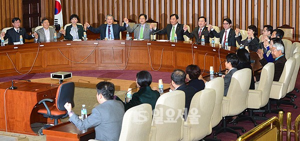 ▲ ⓒ 일요서울 정대웅 기자 8일 오전 국회에서 열린 민주통합당 초선의원 의원총회에서 박기춘 원내대표와 초선의원들이 손을 잡고 파이팅을 외치고 있다. 정대웅 기자 asraiphoto@naver.com 정대웅 기자 photo@ilyoseoul.co.kr 저작권자 © 일요서울i 무단전재 및 재배포 금지 정대웅 기자 다른기사 보기