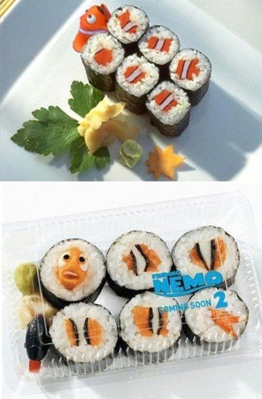 공개된 ‘니모김밥’ 사진 속에는 일반 김밥과 달리 영화 ‘니모를 찾아서’의 주인공 캐릭터 니모가 들어있는 김밥이 담겨있다. 케이스에는 ‘NEMO comming soon 2’라고 적혀있기도 하다.