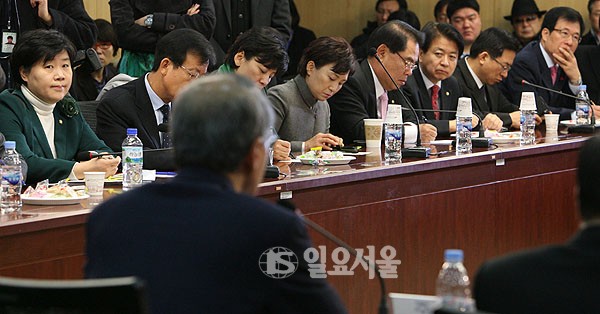 29일 오전 국회 의원회관에서 열린 주춧돌 월례 세미나 '한국 정치의 나아갈길'에서 민주통합당 의원들이 윤여준 전 환경부 장관의 강연을 듣고 있다. '주춧돌'은 민주통합당 의원들의 탈계파 정치모임으로 지난 27일 발족했다.