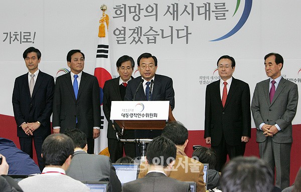 19일 오전 서울 삼청동 대통령직인수위원회에서 청와대 정무수석에 임명된 이정현 당선인 정무팀장을 비롯한 수석비서관들이 인사말을 하고 있다.