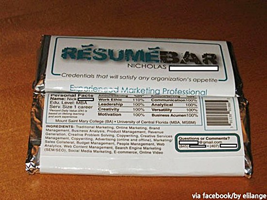 최근 CNBC 등 해외 언론은 미국의 한 구직자가 만든 ‘초콜릿 이력서’를 소개했다. 보통 초콜릿처럼 보이지만 표지에는 구직자의 이름과 출신대학 등이 포함된 이력서다.