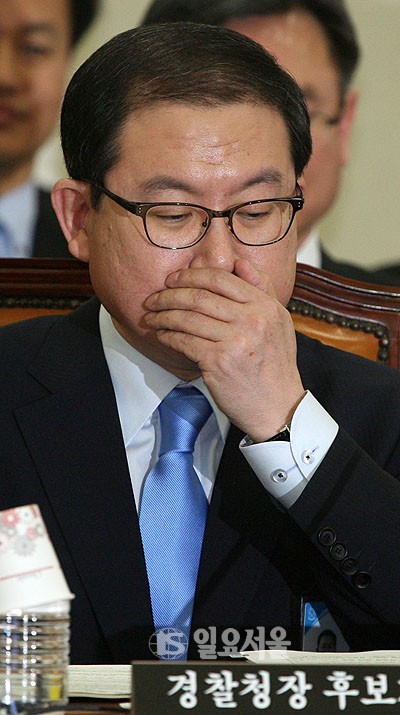 27일 오전 국회 안전행정위원회에서 열린 경찰청장 후보자 인사청문회에서 이성한 후보자가 난감한 표정을 짓고 있다.