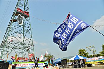 ▲ 현대자동차 비정규직 조합원의 철탑농성 200일째인 지난 4일 울산 북구 명촌동 농성장 아래서 민주노총 울산결의대회가 열리고 있다.<사진=뉴시스>