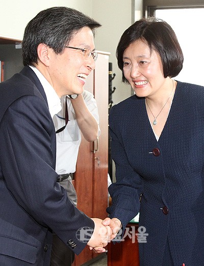 황교안 법무부 장관이 4일 국회 법사위원장실에서 야당 법사위원들을 면담하기 전 박영선 위원장과 악수하고 있다.