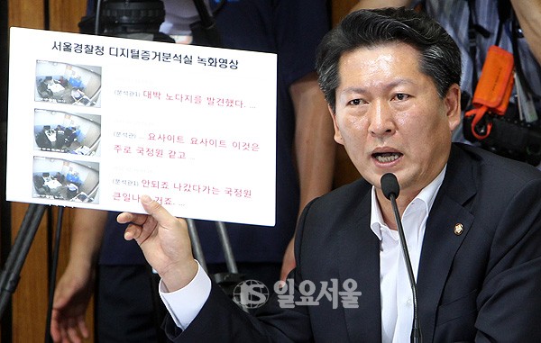 민주당 정청래 의원이 24일 국회에서 열린 국가정보원 댓글 의혹 사건 등의 진상규명을 위한 국정조사특위에서 경찰의 국정원에 대한 수사 녹화자료를 보여주고 있다.