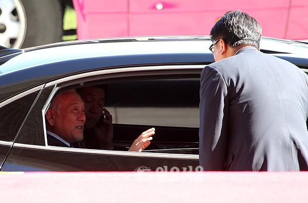 김한길 민주당 대표가 16일 오후 박근혜 대통령, 황우여 새누리당 대표와 3자회담을 갖기 위해 국회에 도착해 정진석 사무총장과 인사하고 있다.