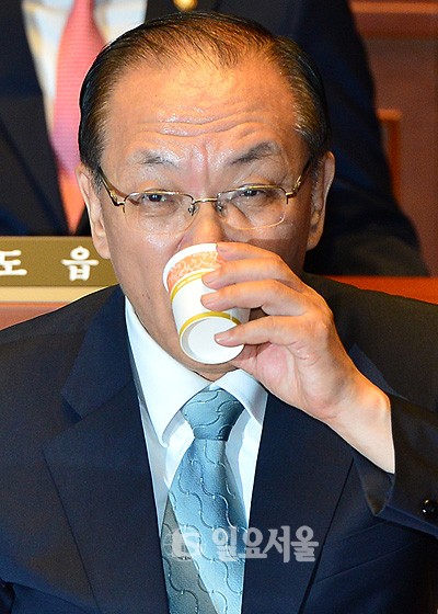 23일 오후 국회에서 열린 새누리당 의원총회에서 황우여 대표가 물을 마시고 있다.
