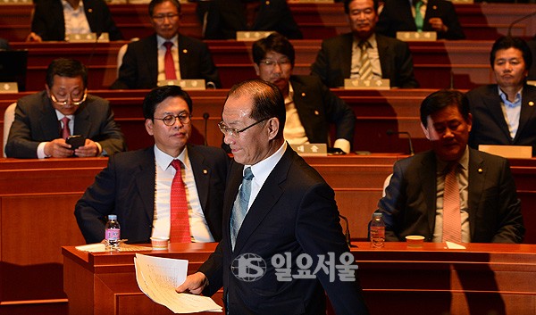 23일 오후 국회에서 열린 새누리당 의원총회에서 황우여 대표가 모두발언을 하기위해 단상으로 향하고 있다.