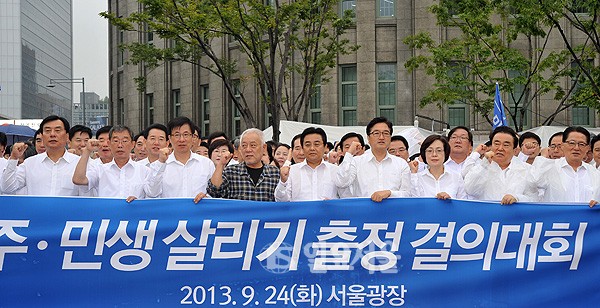 24일 오전 서울 시청광장에서 열린 민주당 '민주, 민생살리기 결의대회'에서 김한길 대표를 비롯한 의원들이 민생살리기를 다짐하며 구호를 외치고 있다.